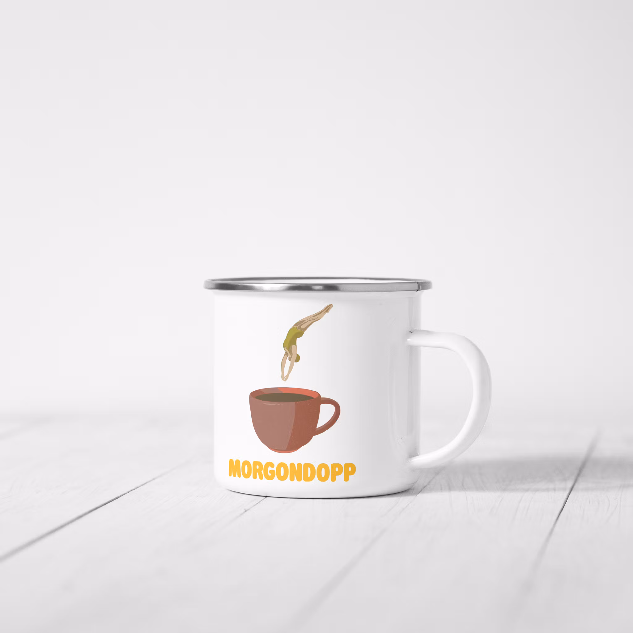 Tillverkad i metall med slitstark emaljbeläggning och förstärkt kant i rostfritt stål för ökad hållbarhet. Varje mugg trycks individuellt och levereras styckvis förpackad.