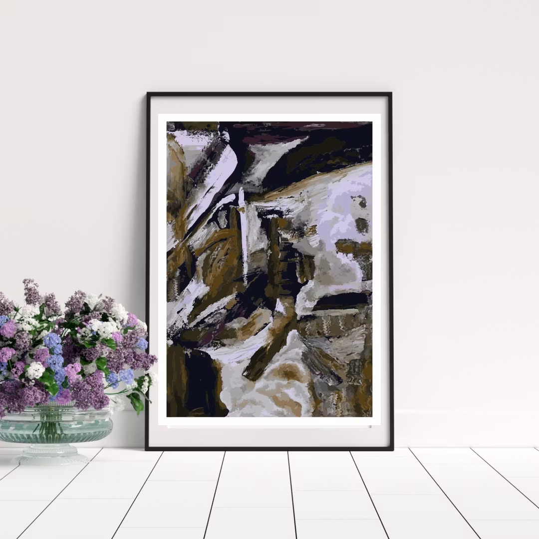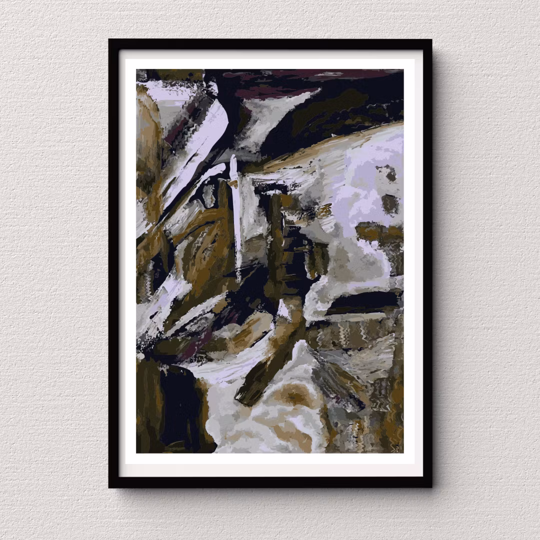 En oljemålning som vilat i många år innan den hittade sin scen. Nu i jordiga toner, men också som "Abstrakt olja" i blått – två versioner, samma känsla av djup och tidlöshet.