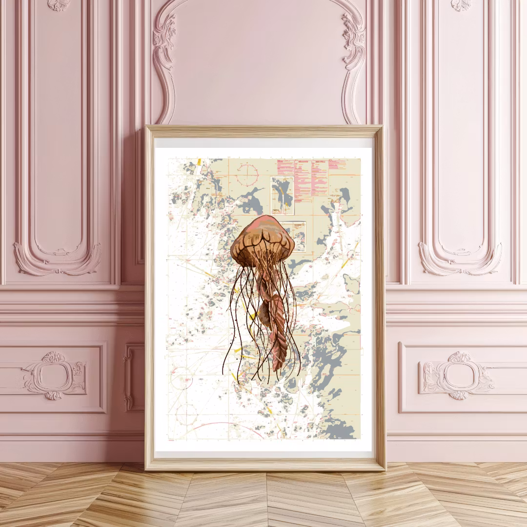 En manet svävar fram över ett subtilt sjökort över Marstrand och Koön. En bild som förankrar havets mystik i ett specifikt landskap.