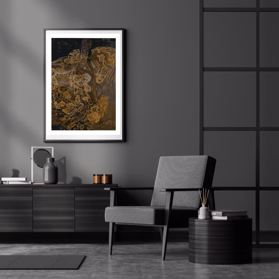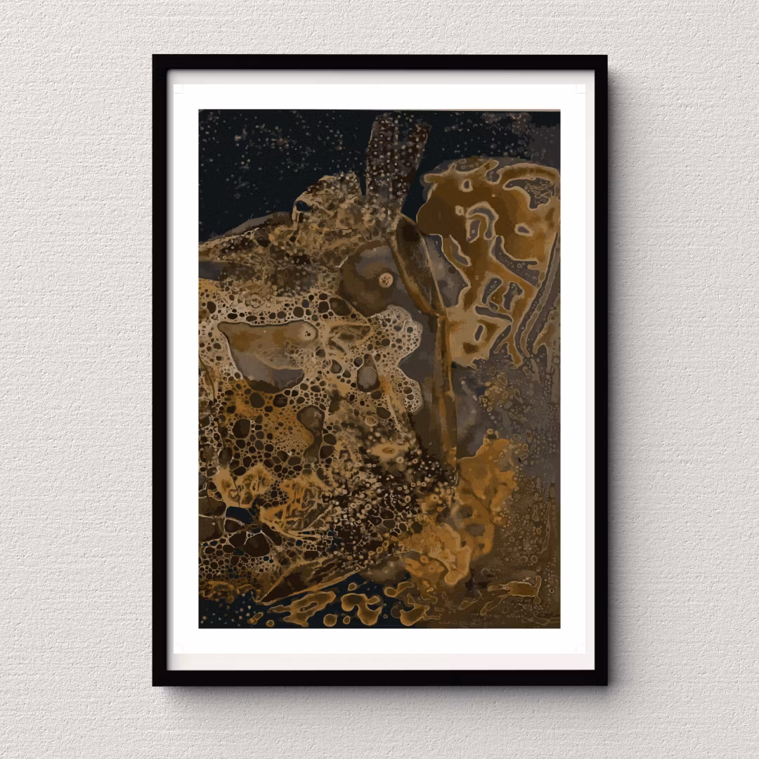 Abstrakta bubblor i rostiga, metalliska toner. Ett motiv som fångar känslan av fest, rörelse och glittrande ytor.