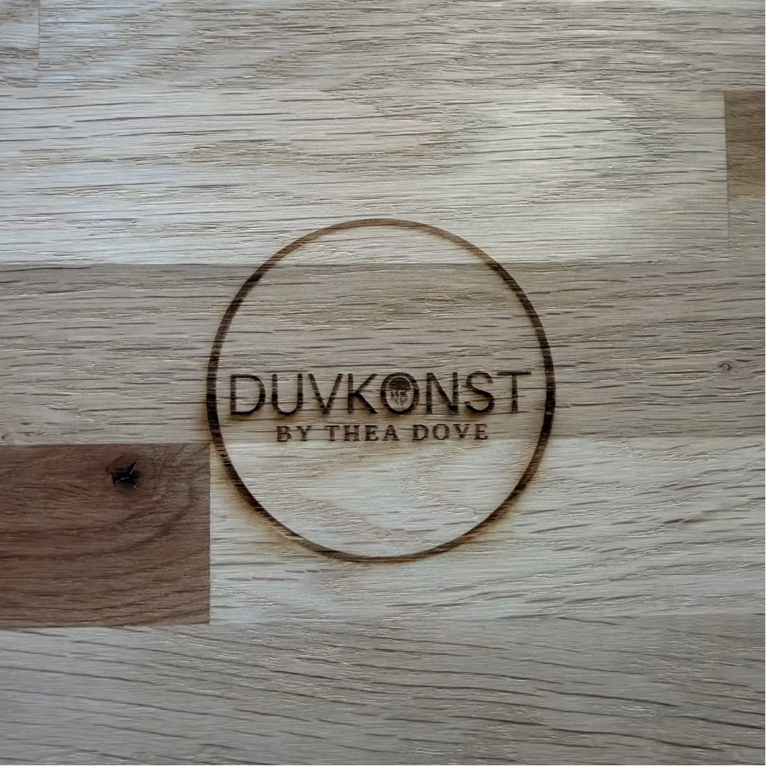 Motivet är laserbränt lokalt, direkt i träet, utifrån Duvkonsts originalmotiv. Eftersom varje bit ek har sin egen karaktär tar laserbränningen uttryck på olika sätt beroende på träets struktur och densitet, vilket ger subtila variationer i både linjer och ton från bräda till bräda.